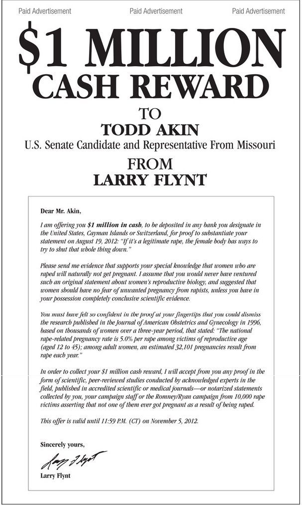 On Sunday, Flynt will run a full-page ad in the St. Louis Post-Dispatch promising a $1 million reward for Akin if the Republican can provide “proof to substantiate” his infamous line, “if it’s a legitimate rape, the female body has ways to try and shut that whole thing down.”