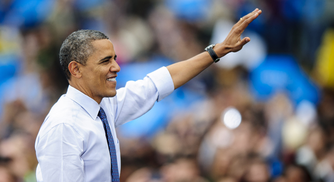 To that end, Obama used every weapon at his disposal. He was introduced by Planned Parenthood president Cecile Richards, then bounded onto the stage sporting a bright pink bracelet for breast cancer awareness month. He repeated his now-standard applause line about Romney’s use of “binders full of women” to find qualified appointees in Massachusetts, a quote that’s taken off among Democrats in a major way. He brought back an old Romney quote from the primaries about getting rid of Roe vs. Wade. On the stage were two bright blue signs, each reading “Women’s Health Security.”