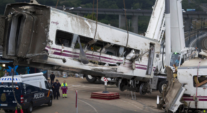Derailed cars are removed as emergency personnel work at the site of a train accident in Santiago de Compostela, Spain on Thursday July 25, 2013. The death toll in a passenger train crash in northwestern Spain rose t... Derailed cars are removed as emergency personnel work at the site of a train accident in Santiago de Compostela, Spain on Thursday July 25, 2013. The death toll in a passenger train crash in northwestern Spain rose to more than 70 on Thursday after the train jumped the tracks on a curvy stretch just before arriving in the northwestern shrine city of Santiago de Compostela, a judicial official said. MORE LESS