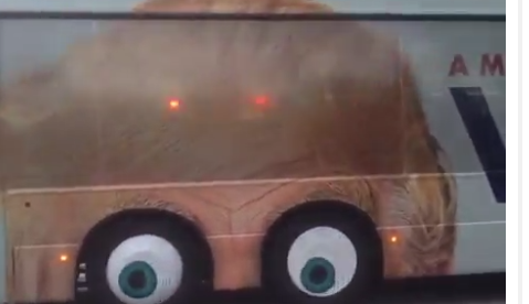 The ad, which covers both sides of the six-wheeled bus, shows blue circles that resemble eyeballs spinning wildly below a forehead that is obviously the U.S. presidential candidate’s.